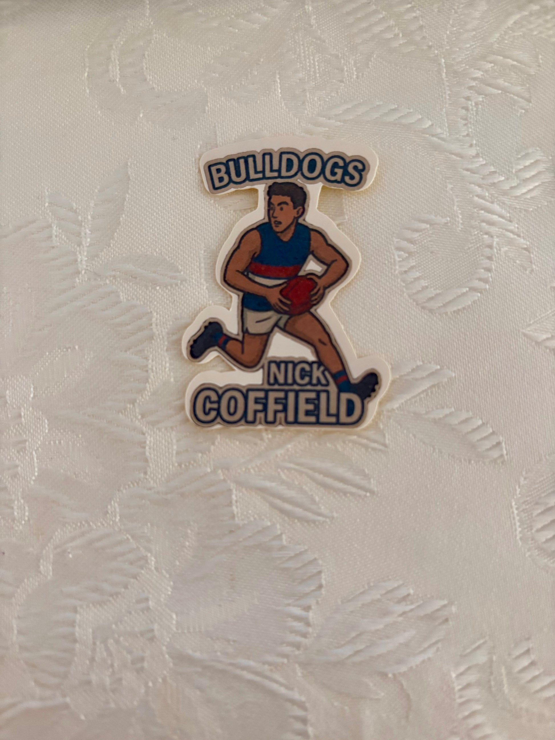 Show your love for the Western Bulldogs with this quirky Nick Coffield Inspired Sticker. Perfect for Bulldog fans with a sense of humor, this sticker features a unique design inspired by Nick Coffield. Stick it on your laptop, water bottle, or anywhere you want to show off your team spirit!